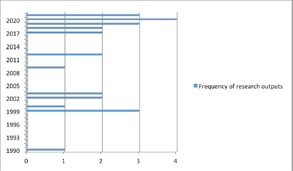 A total of 26 PubMed-indexed publications [13,17–39] published by Nigerian authors and primarily on noma were obtained from our analytical search (Table 2). These papers were published between January 1990 and September 2021 (Figure 1). A trend analysis of these PONs showed that the average output rate per year, from 1990 to 2020 (a total of 31 years), of Nigerian authors (total outputs from 1999 to 2020=23) was 0.74 (23/31, 74.2%).