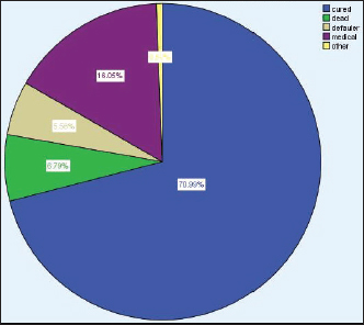 HIV, human immunodeficiency virus. Treatment Outcomes of under-five children with SAMOut of 162 admitted children with SAM, 111 (70.99%) cases recovered from SAM, whereas 11(6.8%) cases died because of SAM (Figure 1). Treatment outcome of SAM by type of diagnosis in the treatment centresThe predominant form of malnutrition in this study was marasmus 69 (42.6%), followed by kwashiorkor 55 (34%). Among the children who presented with marasmus, 48 of them were recovered while 4 died. While among the patients presented with kwashiorkor, 40 of them were recovered while 4 of them died. However, regarding the 3 stunted children, all of them recovered (Figure 2). Table 3. Distribution of treatment for children with SAM (n=162.