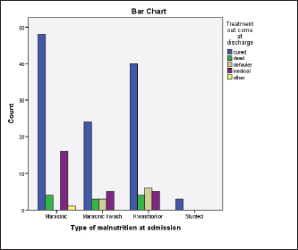 Figure 2. Treatment outcome by type of malnutrition among children with SAM (n=162). Table 4. Predictors of treatment outcome among children with SAM (n=162).
