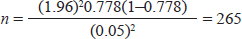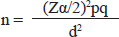 where: n=required sample size Zα/2=standard score (1.96) corresponding to 95% confidence level d=margin of error (0.05) q=1-p