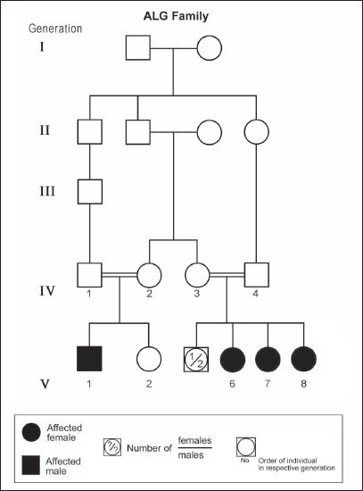 Figure 2. Pedigree of ALG family. Standard pedigree symbols are used.