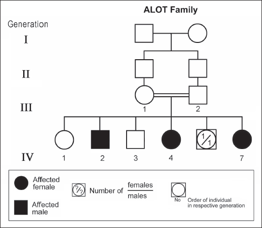Figure 3. Pedigree of ALOT family. Standard pedigree symbols are used. The eight patients who were studied consisted of five females and three males. Their clinical features and investigations are summarized in Table 1. The mean age at assessment was 21.3 years (median=19.5 years, range=9–39 years). The onset of ataxia was early in life at a mean age of 2.1 years (median=1.3 years; range=1–7 years). The disease was relentlessly progressive and two patients in one family (IV.2 and IV.3, ALH Family, Figure 1) lost ambulation, each at the age of 13 years. On examination, all affected individuals had features of ataxia associated with oculomotor apraxia, but no telangiectasia. Two parents belonging to one family (V.6 and V.8, ALG Family, Figure 2) were microcephalic and both had low IQs (72 and 78, respectively). No patient examined had recurrent pulmonary infections, lymphoid or other tumours, skin abnormalities, muscle weakness, or lost sensation for crude touch. The four oldest patients in the group, all of whom belonged to one family (ALH Family, Figure 1), had signs of basal ganglia involvement manifesting as facial dyskinesia (abnormal and involuntary facial movements), and masked face. Deep tendon reflexes were brisk at 9 and 13 years, respectively, in the two patients belonging to one family (V.6 and V.8, ALG Family, Figure 2). They were reduced in individuals of the other two families, who were relatively older (age range=13–39 years). All investigated patients showed cerebellar atrophy on brain MRI (5/5) and had normal levels of alpha-fetoprotein (6/6), carcinoembryonic antigen (5/5), and immunoglobulins (6/6). Also, all those investigated had normal levels of serum albumin (7/7) and cholesterol (5/5), including the patients of the ALH Family (Figure 1) who have had clinical symptoms of the disease for >20 years. In all affected individuals of the three families, molecular genetic testing revealed homozygous missense mutation (630G®C, W210C) of the MRE 11 gene. Table 1. Clinical, biochemical, and neuroimaging features of three families with ataxia telangiectasia-like disorder1.
