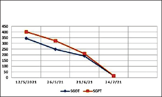 Figure 2. Fall of liver transaminases over time in the index case. *SGOT, Serum glutamic-oxaloacetic transaminase; SGPT, Serum glutamic-pyruvic transaminase. DISCUSSIONChildren with COVID-19 infection have less severe symptoms and most of them present with milder manifestation in form of upper respiratory tract infection. In contrast to COVID-19 infection in adults, incidence of severe and fatal COVID-19 infection is less frequent in children. It is yet not well understood whether this age-related difference in severity is related to differential expression of ACE-2 receptor or lesser prevalence of co-morbidities or due to differential immune response to virus [13,15–17]. It has been postulated that cross-reactive antibodies due to repeated upper respiratory tract infections may confer protection against microbes with similar antigenic epitopes [17–19]. Furthermore, it has been postulated that Bacille Calmette-Guerin (BCG) vaccination may build up CD + 4 T helper 1 immunity, providing some protection against COVID-19 due to the cross-over immunity [20,21]. COVID-19-related liver injury is extrapulmonary manifestation of the disease and is characterised by variable degrees of liver damage due to the disease or its treatment in a patient with or without pre-existing liver disease [22]. Paediatric NAFLD is defined as hepatic steatosis in children aged ≤18 years in the absence of genetic diseases, metabolic disorders, infections like hepatitis C, use of steatogenic drugs, alcohol consumption or malnutrition [23]. Deranged liver enzymes are often observed in patients with COVID-19 usually in the form of elevated hepatic transaminases (SGPT and SGOT). Less frequently, mild elevations in gamma-glutamyl transferase, ALP and total bilirubin have also been reported. However, a significant impairment of liver function resulting in death in COVID-19 may occur rarely [24–27]. The aetiology of liver impairment is likely to be multifactorial, and includes direct liver damage by virus-induced cytopathic effect, immune-mediated inflammatory response, hypoxic injury associated with pneumonia and sepsis and liver injury caused by the use of hepatotoxic drugs [28,29]. In the index case liver enzymes were raised before the administration of paracetamol and therefore, we can completely exclude the possibility that any SGOT/SGPT abnormality caused by drug-induced injury. Duan et al. [30] showed elevated serum levels of IL-1beta, IL-6, and IL-10 in COVID-19 patients with increased SGPT as compared to those patients with normal SGPT. However, Zhou et al. [31] showed no difference in levels of serum interleukins (IL-6 and IL-10) between COVID-19-infected children with and without elevated serum liver enzymes, indicating that interleukins may have questionable role in the pathogenesis of liver injury in COVID-19 paediatric patients]. Our index case has slightly elevated CRP (2.13 mg/dl), however, serum ferritin and serum interleukins were within normal limit. COVID-19-associated multisystem inflammatory conditions (MIS-C) which can present with liver and gastrointestinal involvement was ruled out in our case as our patient doesn’t meet the case definition of MIS-C given by World Health Organization [7,32,33]. Of interest, Cai et al. [34] study reported elevated transaminases at admission in COVID-19 children and adult patients due to the direct cytopathic effect of coronavirus infection on hepatocytes. A study from Italy shows an association between hepatic steatosis and SARS-CoV-2 infection in children [35]. In our case, the patient didn’t have underlying liver disease and liver impairment was found at first presentation of COVID-19 infection suggesting the possibility of direct cytopathic effect of coronavirus. Due to the gradual decline in liver enzymes, significant clinical improvement over time and financial constraints workup for autoimmune causes, 24-hour urine copper or liver biopsy were not considered. Our patient presented with hepatitis with non-alcoholic fatty liver with mild respiratory symptoms adding to the spectrum of the illness that SARS-CoV-2 can present in children. The patient had a mild illness, did not have hypoxemia, pneumonia or cardiac dysfunction. Apart from SARS-CoV-2 infection, no other infectious aetiologies to explain persistent hepatitis and NAFLD were found. CONCLUSIONThis case report shows the spectrum of the presentation of COVID-19 infection in children and a unique association of coronavirus disease and fatty liver with hepatitis in children. Hepatic impairment can be observed in mild infection and patients with hepatitis should be investigated for COVID-19 infection during the pandemic time along with workup for other hepatotropic infections. NAFLD in COVID-19-exposed children warrant prolonged follow up. Further studies are required to determine the incidence and severity of hepatic involvement and to understand the underlying mechanism. CONFLICT OF INTERESTSThe authors declare no conflict of interests. FUNDINGNone. ETHICAL APPROVALSigned informed consent for participation and publication of medical details was obtained from the parents of this child. Confidentiality of patient’s data was ensured at all stages. The authors declare that ethics committee approval was not required for this case report. REFERENCES
