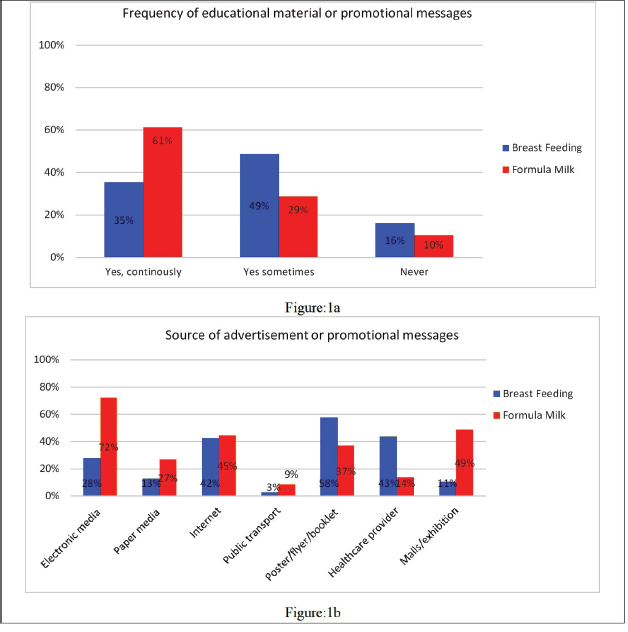 When asked whether breast milk or formula milk is more beneficial to the health of babies, 856 (94%) reported breastmilk as more beneficial compared to formula milk. In addition, participants were also asked about exposure to educational or promotional material regarding infant feeding. Almost two thirds were continuously exposed to promotional messages on formula feeding (546, 61%), compared to only 321 (35%) being exposed to educational material on BF. All participants (100%) who have been exposed to messages regarding infant feeding (breastmilk or formula milk) have been exposed through electronic media (television and radio), 72% of these messages were promoting formula milk, compared to only 28% promoting BF. The exposure through flyers, posters and booklets was 94% with better promotion of BF than formula feeding (58% and 37%, respectively). Participants exposed to infant feeding promotional messages and educational material through the internet constituted 87% (45% regarding formula milk and 42% regarding BF). A total of 59% were exposed at malls and exhibitions (49% exposure to formula milk advertisement and 11% to BF promotion). Healthcare providers were the main source for 57% of participants, 14% of them promoting formula milk in some way and 43% promoting BF. Exposure through newspapers and magazines was in 40% of participants (Figure 1a and b).