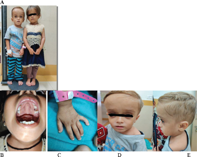 ABSTRACTRussell-Silver syndrome, also called asymmetric dwarf dysgenesis syndrome is an uncommon genetic disorder presenting with low birth weight, failure to thrive and growth retardation (short stature), developmental delay, facial dysmorphism and hemihypertrophy. The estimated incidence is between 1 case in 3,000 to 1 case in 100,000. We are hereby reporting one such case of postnatal growth retardation with facial dysmorphism and several other features of Russell-Silver syndrome and confirmed by genetic analysis. KEYWORDSShort stature; Russel-Silver syndrome. INTRODUCTIONRussell-Silver syndrome, also called asymmetric dwarf dysgenesis syndrome, is an uncommon genetic disorder presenting with low birth weight, failure to thrive and growth retardation (short stature), developmental delay, facial dysmorphism and hemihypertrophy. The estimated incidence is between 1 case in 3,000 to 1 case in 100,000 [1]. We are hereby reporting one such case of postnatal growth retardation with facial dysmorphism and several other features of Russell-Silver syndrome, which was not even suspected till 6 years of age, and confirmed by genetic analysis. CASE REPORTA 6-year-old male child, born out of a second-degree consanguineous marriage reported with chief complaints of fever and cough. The child was short statured with facial dysmorphism. He was worked up for fever and was found to have NS1-positive dengue fever with no warning signs and was treated symptomatically. The child was then worked up for short stature and facial dysmorphism. On physical examination, the child was a thin and short-statured child. Weight was 8 kg, height was 76 cm. Weight, height and weight for height and body mass index (BMI) were less than the third centile on World Health Organisation growth charts. The child was born small for gestational age with a birth weight of 1,500 g. The child had pseudo hydrocephalus with a head circumference (50 cm) normal for age. He was found to have a triangular face with low-set ears, a depressed nasal bridge, hypoplasia of the upper lip, high arched palate and crowding of teeth. The child had a high-pitched voice since the child started speaking. Upper to lower segment ratio was 1.24:1 with an upper segment length of 42 cm and lower segment length of 34 cm, while normal ratio is 1.1:1. The child had limb length discrepancy with left lower limb 2 cm shorter than the right lower limb. He was found to have clinodactyly (Figure 1). Echocardiography and ultrasonography (USG) of the kidney, ureter and bladder were normal. On family history, he had an elder sibling, a 10-year-old girl child with similar facial features, short stature and dysmorphism. USG abdomen and pelvis revealed absent ovaries in this girl. The diagnosis was overlooked till 6 years of age. Based on the clinical criteria, Russell-Silver syndrome was considered by us, and parents were counselled for genetic analysis by explaining that ‘it is just not short stature.’ Molecular analysis report of methylation-specific polymerase chain reaction (MSPCR) for the MEST gene showed the absence of a paternal allele, thereby confirming the clinical diagnosis of Russell-Silver syndrome. DISCUSSIONRussell-Silver syndrome is a clinically as well as genetically diverse disorder of growth presenting with slow foetal growth (intrauterine growth restriction), low birth weight and growth retardation after birth, with a wide range of additional dysmorphic features [1,2] of varying severity like a triangular facial appearance with a relatively large head, a prominent forehead well appreciated on viewing from the side of the face, body asymmetry and clinodactyly of the fifth digit. Babies born have a low birth weight and often have significant feeding difficulty, growth retardation and also do not gain weight at the expected rate. It is a rare genetic disease considered an imprinting disorder. Pregnancies are unremarkable with no teratogenic exposure or significant antenatal history. Although it is thought that the insult occurs at an early age the nature of the insult being intrinsic or extrinsic is not known [3]. Overall prevalence worldwide is more than 500 cases and is reported in all age groups with no difference in incidence in males and females [1,2]. It is usually sporadic with no significant family history. Most of the affected children have normal psychomotor development but motor and/or speech delay is common [2]. In most of the affected children, a defect in chromosome 7 or 11 can be identified. These children have a perfectly normal pubertal development. There is no specific diagnostic test for Silver-Russell syndrome and the diagnosis is purely clinical (Table 1) [1,2].