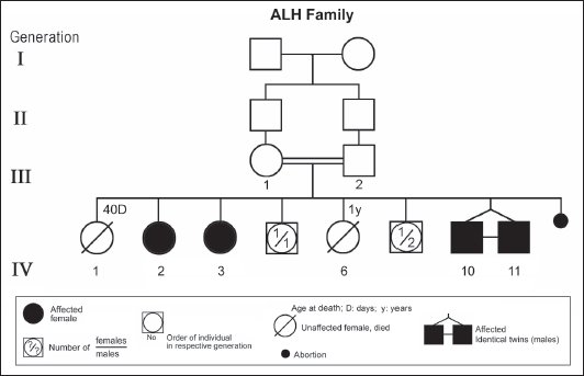 Figure 1. Pedigree of ALH family. Standard pedigree symbols are used.