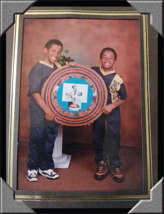 Figure 1. The conjoined twins Hassan and Hussein holding a traditional Sudanese food tray cover made of coloured date palm tree thatch. Their photograph before surgical separation is mounted on the tray (below) and another photograph with the surgeon Professor Lewis Spitz (above). Communications in Saudi Arabia were done by the uncle of the twins, Dr. Yousif Eshag who was working at King Saud Medical City, also known as Shemaisi Hospital, in Riyadh. These resulted in the humane and generous Royal Decree to sponsor the treatment of the twins in London, accompanied by their parents. Dr. Yousif Eshag joined the family to communicate on their behalf and handle their affairs. Surgery was done by Professor Lewis Spitz, and they were the first conjoined twins to be separated in the UK [6]. The twins have stayed in the UK with their family, within easy reach of the medical care that they still require (Figure 1). Both accomplished university degrees. The SJP has highlighted previously the story of Rital and Ritaj, the Sudanese craniopagus conjoined twins who were born and had their early neonatal management at Soba University Hospital, Khartoum [7,8]. Through the BBC, the girls’ parents, who are both doctors, contacted the charity organisation “Facing the World” which arranged the transfer of the twins to the United Kingdom with their parents, and organised all the logistics and paid for the surgery [9]. Eight years later, they were reunited with the British doctors who saved their lives and expressed their sincere gratitude [10]. The humane contribution of the Kingdom of Saudi Arabia should also be credited. Since its launch in 1990, Saudi Arabia’s Conjoined Twins Program has treated more than 130 cases from countries around the world, paving the way for several conjoined twins from different nationalities including Sudanese to lead a normal life. Ironically, the Tanzanian conjoined twins who were separated in October 2023 are named Hassan and Hussein! [11]. REFERENCES
