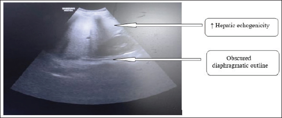 Figure 1. USG of abdomen showing increased liver span and increased hepatic echogenicity (arrow) with the blurring of portal/hepatic vein and obscured diaphragmatic outline (arrow).