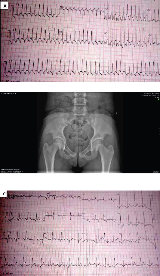 Figure 1. (A) SVT in Case 4. (B) SVT with aberrancy and (C) sinus rhythm in the 3-month-old child after the first episode of SVT. Case 7A 10-year-old girl presented with a weak history of cough associated with palpitation. She had a previous history of breathlessness, syncopal attacks and palpitations following febrile illnesses and cough. On examination, she was conscious but dyspnoeic and tachypnoeic with basal crepitation at the left lower zone. A cardiovascular examination revealed a pulse rate of 186 bpm which was regular with no murmur but had a heart rate of 226 bpm. A diagnosis of possible arrhythmia secondary to a respiratory tract infection was considered. An electrocardiograph confirmed SVT. Echocardiography suggested a tachycardia-induced cardiomyopathy, possibly secondary to intermittent SVT was made. A Holter monitoring echocardiograph was requested but was not done due to financial constraints. She was commenced on digoxin tabs, furosemide, enalapril and calcium. A repeat electrocardiography done 48 hours later showed a normal sinus rhythm while an echocardiography done 72 hours later showed a structurally normal heart with good cardiac function. The patient was weaned off the antifailure drugs and discharged. The patient has been on follow up, the fast heartbeat resolved and a repeat electrocardiograph showed sinus rhythm. Case 8A 12-year male, presented with a history of palpitation, syncopal attacks and shortness of breath on moderate exertion of 2 months duration. There was no history of orthopnoea, paroxysmal nocturnal dyspnoea or leg swelling. There was no previous history of hospital admission. There was a similar history in the father who had a pacemaker insertion done in England at 32 years of age. On examination, he was conscious, not dyspnoeic. His pulse was regular, full volume with a rate of 48 bpm. The precordium was active, the heart rate was 50 bpm and the apex beat was at the fifth left intercostal space midclavicular line. Only the first and second heart sounds were heard and there was no murmur. The electrocardiograph showed sinus bradycardia. Echocardiography showed a structurally normal heart. A diagnosis of possible symptomatic familial sinus bradycardia was made but to exclude a complete heart block. His parents were counselled to do a Holter monitoring electrocardiograph which confirmed a sinus bradycardia. The child was referred, at his parents’ request, to a cardiologist in England for further evaluation and intervention. A diagnosis of heart block was confirmed and he was to have a pacemaker insertion. He has been lost to follow up. DISCUSSIONWe retrospectively report the clinical presentation, management and short-term clinical outcomes of eight children, spanning neonatal to adolescent age groups, with different forms of arrhythmias, highlighting challenges experienced in their management. As summarised in Table 1, the forms of arrhythmias included sinus bradycardia, heart block, SVT and atrial flutter. Arrhythmia in children has been documented in both genders. Five of the eight children in our reports were females, this is similar to the report of Clausen et al. [4] and Sadoh et al. [12] who, respectively, reported that 56% and 59% of their subjects were females. The reason for this sex predilection is not immediately clear. Fever, fast breathing and cough were the commonest presenting features in the current report. This is similar to the report of Chockalingam et al. [15] in Chennai. It will, therefore, be appropriate to encourage healthcare practitioners involved in the care of children to always watch out for the possibility of rhythm disorders in children presenting with the above symptoms to encourage early diagnosis and prompt management of rhythm disorders in such children. Arrhythmias in children can present in various forms depending on the underlying aetiology [15]. In this case series, the major form of arrhythmia observed in the neonatal age group was heart block which was mostly due to complex congenital heart defects inclusive of defects of the atrium which may be due to disruption of conduction pathways. Congenital heart block has been associated with atrioventricular septal defect [16]. Detection of foetal bradycardia in utero suggested a rhythm problem in these patients informing the need for a foetal echocardiography which, however, was not done in any of the patients. The immediate reason for this omission is not known; however, it is plausible to assume that it was due to poor awareness on the part of the health practitioner who supervised the antenatal care. Hence, there may be a need to ensure screening of high-risk pregnant women with foetal echocardiography, for example, when findings of obstetric ultrasound are suspicious [17]. Foetal echocardiography can diagnose most significant congenital heart lesions as early as 17–19 weeks of gestation. Also, M-mode echocardiography can diagnose rhythm disturbances in the foetus and give information on the success of antiarrhythmic therapy administered to the mother [18]. Arrhythmias are common in children with CHD [19]. It is either due to coexisting congenital abnormalities of the specialised conduction system or in response to haemodynamic influences on chamber dimensions, muscle mass and metabolism of myocardial tissue [20]. In the current report, all the neonates with arrhythmia had CHD. Rhythm abnormalities in foetuses and neonates may heighten paediatric and obstetrics clinicians’ suspicion of an underlying CHD. Delays in the diagnosis and management of these arrhythmias in these children can contribute to mortality and worsen morbidity in them [19]. SVT is the most common arrhythmia in children as was observed in our report. Venugopalan et al. [8] reported three cases of SVT, each with varying presentations. However, none of the patients reported by Venugopalan et al. [8] presented in infancy and only one had an underlying congenital heart defect. In our case seri